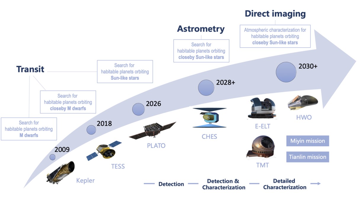 近邻宜居行星的探测与表征是未来系外宜居行星研究的前沿方向,例如下一代的空间望远镜--美国的宜居世界天文台(Habitable World Observatory, HWO)与中国的“觅音计划”(Miyin)通过直接成像法开展近邻类日恒星宜居带行星大气的精细刻画与表征(图2)。基于凌星法,Kepler和PLATO所发现宜居带行星的宿主恒星大部分远于数百乃至上千pc,难以为直接成像法所后随探测。CHES利用高精度天体测量法开展近邻类日恒星周围宜居带行星的发现与刻画,可独立获得行星的三维轨道与真实质量。此外,CHES的发现将显著提高“觅音计划”等直接成像光谱观测空间任务的效率, 为其预先提供筛选核心观测样本, 将宝贵的观测资源聚焦于宜居行星的大气精细刻画, 进而表征生命信号。