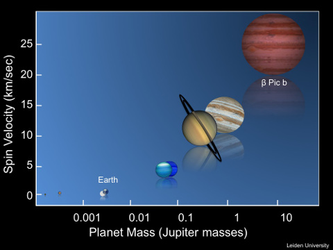 2014年4月30日在《自然》杂志上公布的结果表明,βPictoris b(绘架座b)这颗系外行星的质量是木星的6到16倍,半径约为木星的1.65倍,公转一周需要20年,其宿主星是一颗较年轻的恒星,距离地球63光年。近红外观测表明,这一行星自转速率比太阳系中的任何行星都要快得多。它的自转速率是每秒25千米(约8小时),快于木星的每秒13.3千米(约10小时)与地球的每秒0.5千米(约24小时)( Dali Kong et al.,in MNRAS 2014 )。