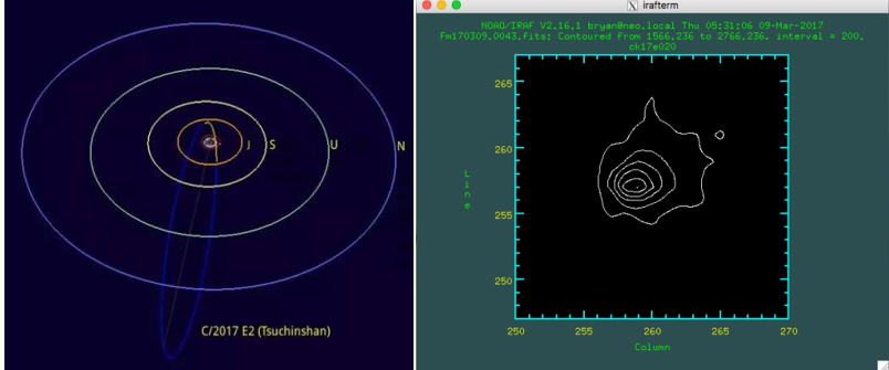近地天体望远镜新发现1颗彗星C/2017 E2 (Tsuchinshan)。该彗星的轨道倾角i=79度,几乎垂直于黄道面,同时获得了该彗星的活动性特征。该成果被列为2017年度第二季度“中科院科技创新亮点成果”候选项目。C/2017 E2 (Tsuchinshan)彗星的轨道和形态如下: