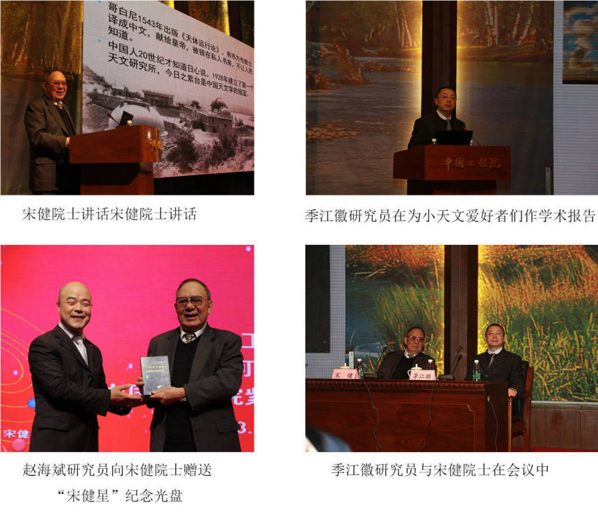 2015年3月16日下午,“宋健星”命名仪式暨学术报告会在北京中国工程院隆重举行。紫金山天文台行星科学与深空探测实验室主任、中国科学院行星科学重点实验室副主任季江徽研究员,和紫金山天文台盱眙天文观测站站长、中国科学院行星科学重点实验室成员赵海斌研究员受邀参加了本次会议。